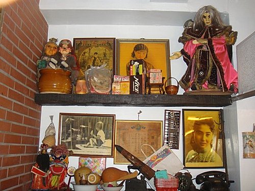 櫃上擺著泛黃照片、布袋戲和公仔、仁丹木造招牌,